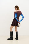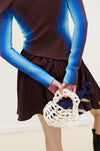 The fish motif is abstracted into sculptural, crocheted impressions that wrap across the chest in textured, organic shapes, blending the fluidity of nature with the structure of the body. Water, a central theme, is explored through texture and print. A pattern inspired by light reflections on rippling water evokes both movement and serenity, capturing nature’s energy in fabric.