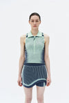 Compression tennis/golf polo cropped top. Strategic color-blocking holds different stretch properties to work with the muscles for optimum performance. It's moisture wicking and soft
