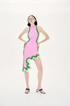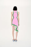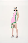 Signature wavy asymmetric dress in sustainably sourced yarns. Side border details create a slimming optical illusion.