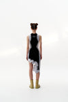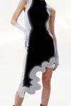 Wavy "spray painted" asymmetric dress in sustainably sourced yarns. Side stripe details create a slimming optical illusion, while the statement print and wavy hem steal the show.