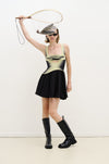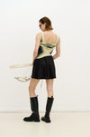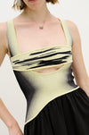 The fish motif is abstracted into sculptural, crocheted impressions that wrap across the chest in textured, organic shapes, blending the fluidity of nature with the structure of the body. Water, a central theme, is explored through texture and print. A pattern inspired by light reflections on rippling water evokes both movement and serenity, capturing nature’s energy in fabric.