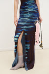 The fish motif is abstracted into sculptural, crocheted impressions that wrap across the chest in textured, organic shapes, blending the fluidity of nature with the structure of the body. Water, a central theme, is explored through texture and print. A pattern inspired by light reflections on rippling water evokes both movement and serenity, capturing nature’s energy in fabric.