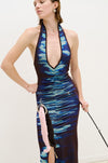 Lake print lurex maxi halter dress