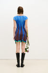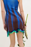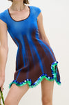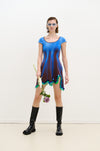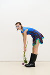 The fish motif is abstracted into sculptural, crocheted impressions that wrap across the chest in textured, organic shapes, blending the fluidity of nature with the structure of the body. Water, a central theme, is explored through texture and print. A pattern inspired by light reflections on rippling water evokes both movement and serenity, capturing nature’s energy in fabric.