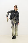 The fish motif is abstracted into sculptural, crocheted impressions that wrap across the chest in textured, organic shapes, blending the fluidity of nature with the structure of the body. Water, a central theme, is explored through texture and print. A pattern inspired by light reflections on rippling water evokes both movement and serenity, capturing nature’s energy in fabric.