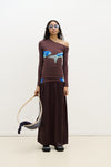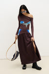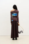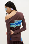 The fish motif is abstracted into sculptural, crocheted impressions that wrap across the chest in textured, organic shapes, blending the fluidity of nature with the structure of the body. Water, a central theme, is explored through texture and print. A pattern inspired by light reflections on rippling water evokes both movement and serenity, capturing nature’s energy in fabric.