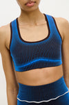 Compression bra top with contoured knitting around the front for added support, and a reflective strip at the back for safety.