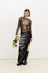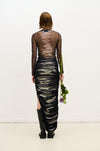 The fish motif is abstracted into sculptural, crocheted impressions that wrap across the chest in textured, organic shapes, blending the fluidity of nature with the structure of the body. Water, a central theme, is explored through texture and print. A pattern inspired by light reflections on rippling water evokes both movement and serenity, capturing nature’s energy in fabric.