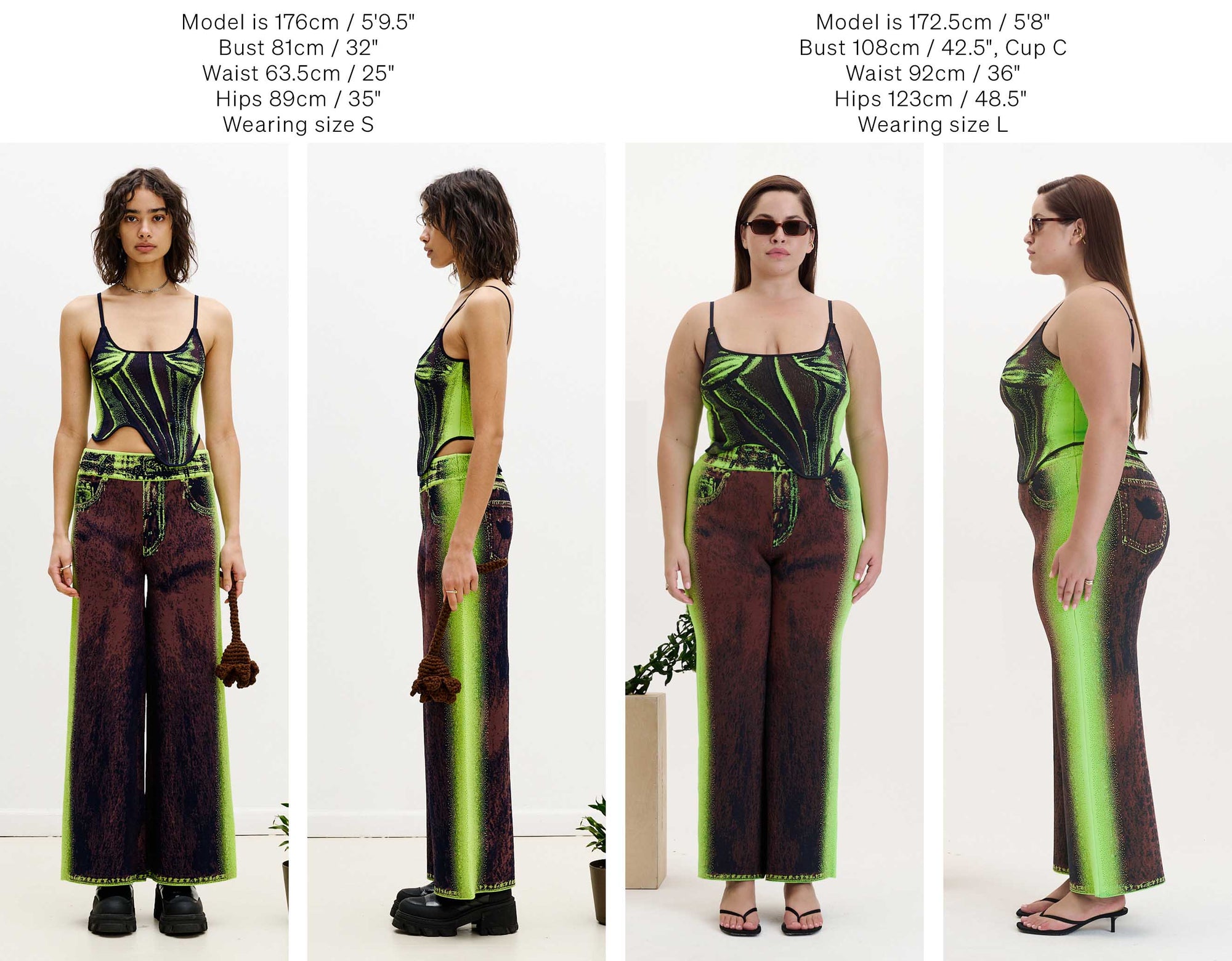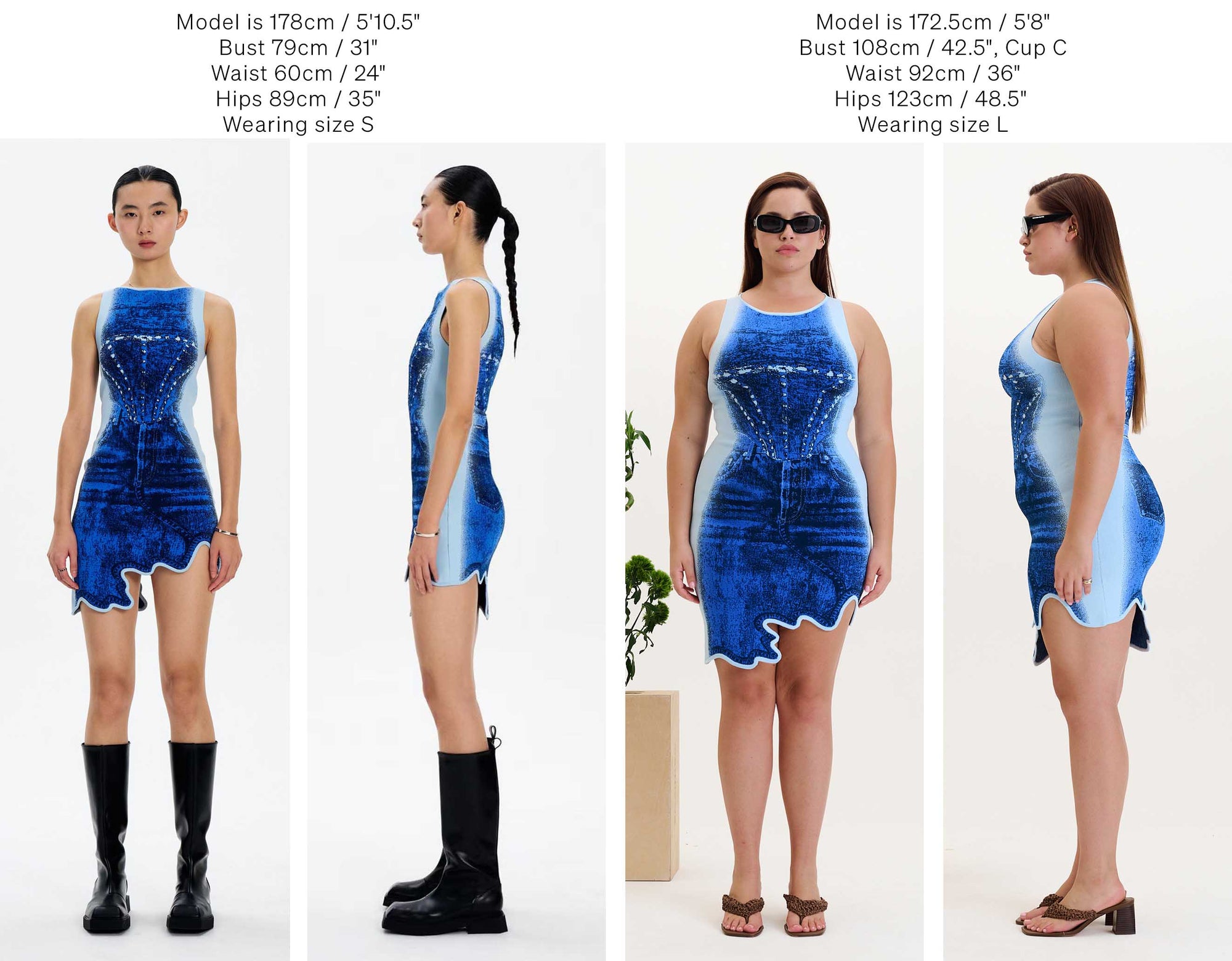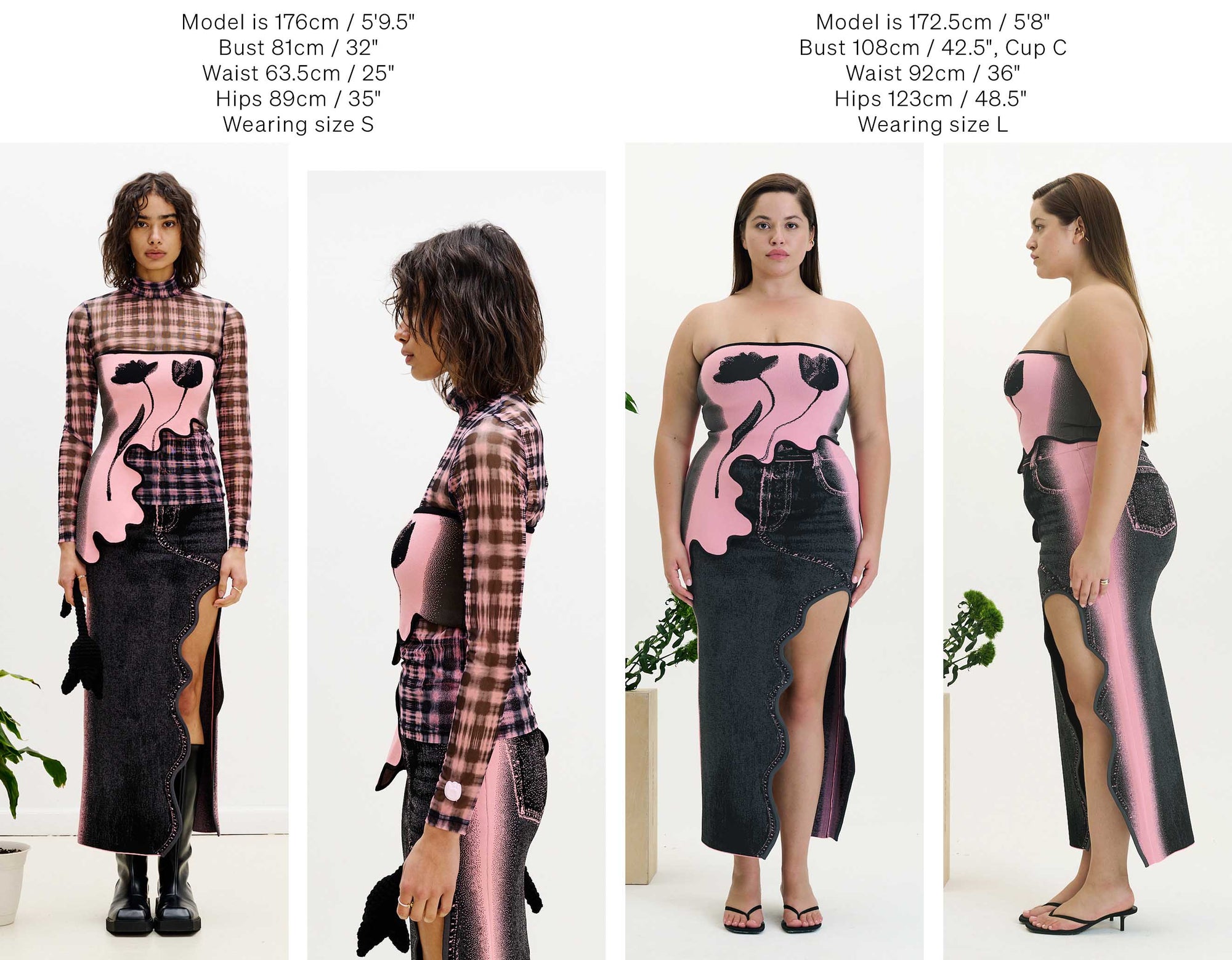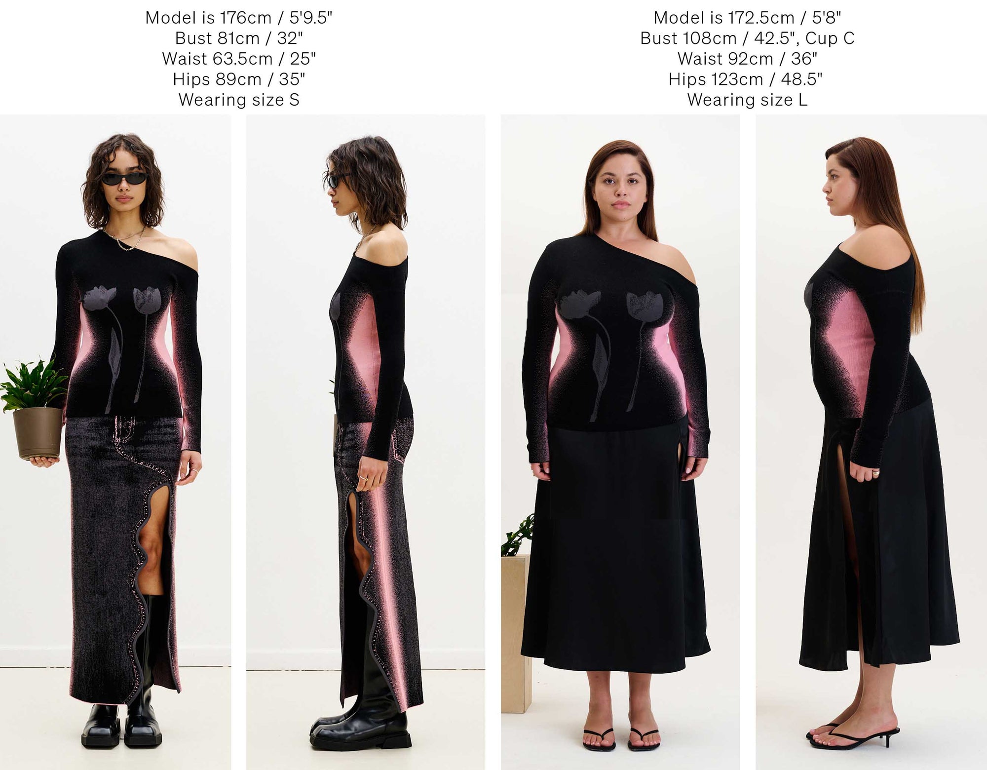 Below we have photographed some of our best selling silhouettes in size S & L for your reference.