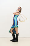 The fish motif is abstracted into sculptural, crocheted impressions that wrap across the chest in textured, organic shapes, blending the fluidity of nature with the structure of the body. Water, a central theme, is explored through texture and print. A pattern inspired by light reflections on rippling water evokes both movement and serenity, capturing nature’s energy in fabric.