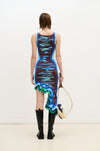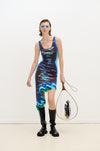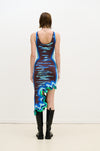 Ocean print reversible wavy asymmetric dress in sustainably sourced yarns. Side border details create a slimming optical illusion.