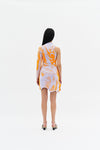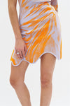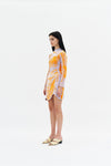 One sleeve wavy mini dress in sustainably sourced yarns. 3D trompe l'eoil print mimics organza draped over the body.