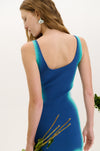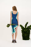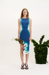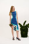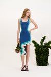 Reversible wavy asymmetric dress in sustainably sourced yarns. Side border details create a slimming optical illusion.