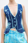 The spirit of activism is woven throughout the collection, with designs that merge utility and artistry. Trompe l’oeil utility artworks transform everyday items into symbols of protest—flower cuttings and tools peek out of faux pockets, evoking a sense of preparedness and action. Mixed media pieces incorporate textured, feathery cotton yarns to mimic the natural elements of grass and moss, further grounding the collection in the earth that sustains us.