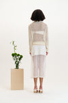 As the collection evolved, we looked forward to summer moments spent resting under trees in the park where the dappled sunlight filters through the leaves, creating a dynamic, ever-shifting play of light and shadow on the body. This imagery informs much of the collection, from the knitted jacquards to the delicate draping’s and gatherings of lightweight fabrics.