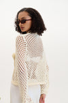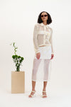 Flowers, too, take on new dimensions this season. Hand-crocheted 3D blooms appear throughout the collection, their forms enhanced by subtle changes in yarn that create an integrated sense of shadow, as if lit by sunlight from above. This motif continues in striped styles where a single flower, knitted directly into the fabric, etched in soft relief, quiet, sculptural, and sun-touched.