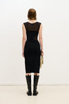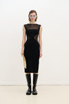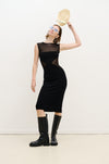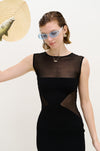 The fish motif is abstracted into sculptural, crocheted impressions that wrap across the chest in textured, organic shapes, blending the fluidity of nature with the structure of the body. Water, a central theme, is explored through texture and print. A pattern inspired by light reflections on rippling water evokes both movement and serenity, capturing nature’s energy in fabric.