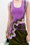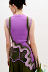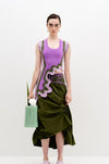 The spirit of activism is woven throughout the collection, with designs that merge utility and artistry. Trompe l’oeil utility artworks transform everyday items into symbols of protest—flower cuttings and tools peek out of faux pockets, evoking a sense of preparedness and action. Mixed media pieces incorporate textured, feathery cotton yarns to mimic the natural elements of grass and moss, further grounding the collection in the earth that sustains us.