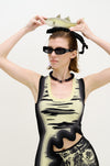 The fish motif is abstracted into sculptural, crocheted impressions that wrap across the chest in textured, organic shapes, blending the fluidity of nature with the structure of the body. Water, a central theme, is explored through texture and print. A pattern inspired by light reflections on rippling water evokes both movement and serenity, capturing nature’s energy in fabric.