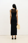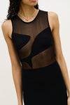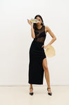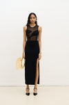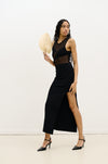 The fish motif is abstracted into sculptural, crocheted impressions that wrap across the chest in textured, organic shapes, blending the fluidity of nature with the structure of the body. Water, a central theme, is explored through texture and print. A pattern inspired by light reflections on rippling water evokes both movement and serenity, capturing nature’s energy in fabric.