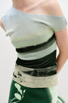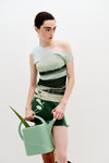 The spirit of activism is woven throughout the collection, with designs that merge utility and artistry. Trompe l’oeil utility artworks transform everyday items into symbols of protest—flower cuttings and tools peek out of faux pockets, evoking a sense of preparedness and action. Mixed media pieces incorporate textured, feathery cotton yarns to mimic the natural elements of grass and moss, further grounding the collection in the earth that sustains us.